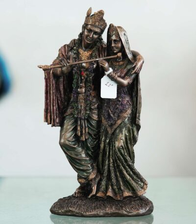 A beautiful and intricate bronze statue depicting Radha and Krishna, two central deities in Hinduism.