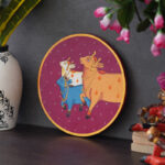 A beautiful pichwai artwork showcasing three cows in a perfect circle. The cows are adorned with intricate jewelry and stand on a wooden plate with a colorful floral border.